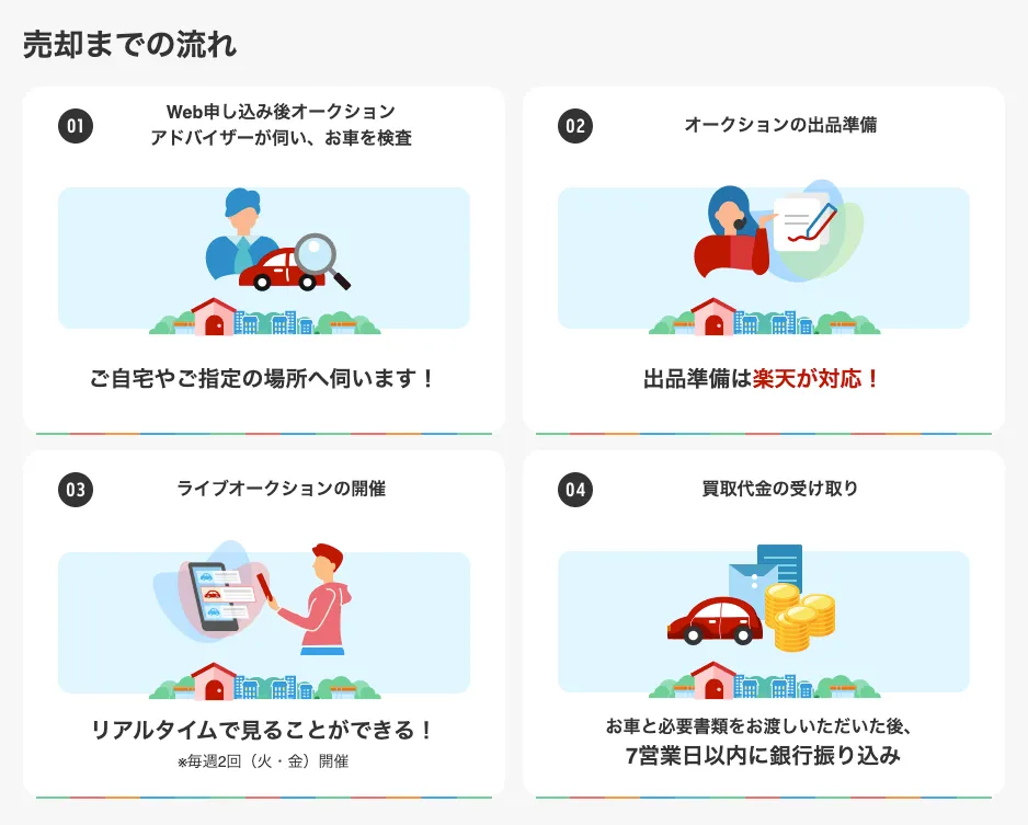 - 売却完了: 落札後、車両の引き渡しや代金の受け取りも楽天が対応。