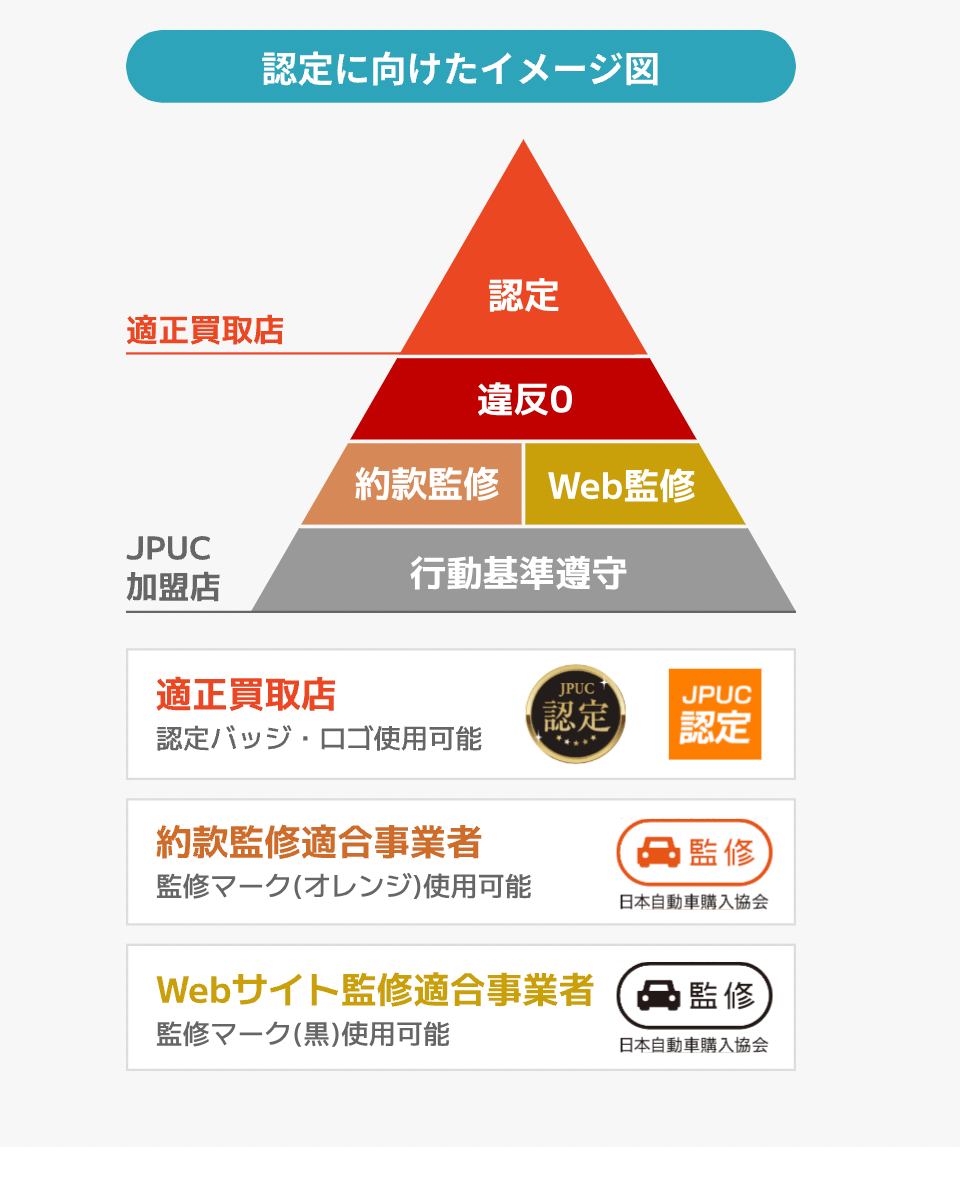 - 使用している買取契約書が、JPUCの監修を受けているか、またはJPUCの自動車買取モデル約款を採用していること。