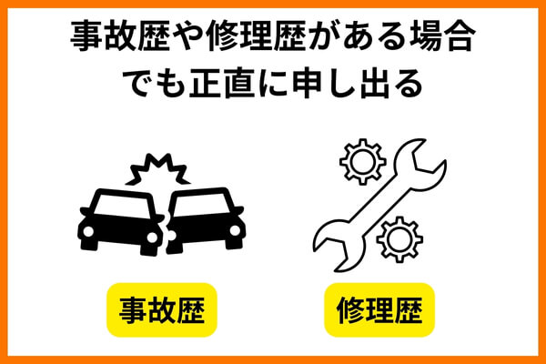 事故歴や修復歴がある場合、査定前に必ず正直に申告することが重要です。事故歴や修復歴は買取価格にマイナス査定をもたらす要因となり、査定時にそれを隠す利用者も少なくありません。