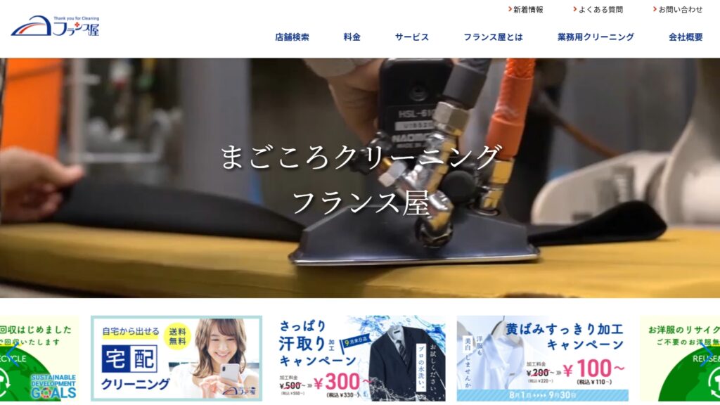 フランス屋は、近畿地方を中心に150以上の店舗を展開している、創業50年の老舗クリーニングチェーン店です。